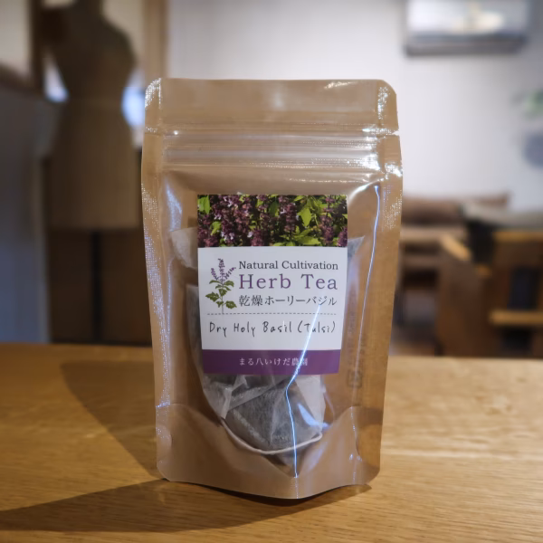 手作業で株をつるし、最後に低温乾燥させたホーリーバジルのハーブティーです。