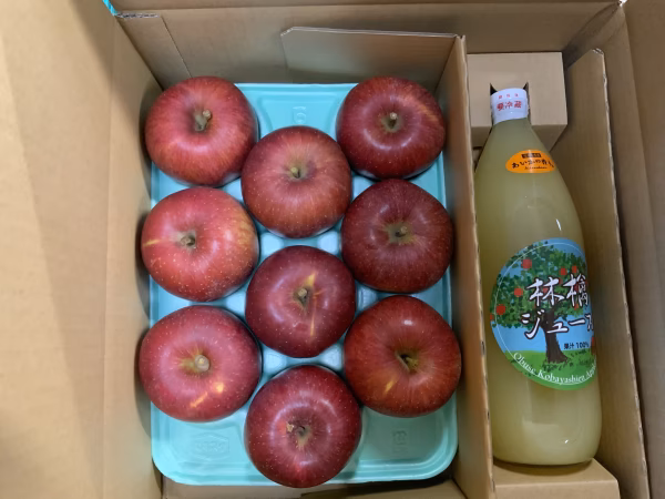 りんごは6〜10玉(大きさにより個数が前後します)、ジュースは1ℓ入り1本のセットです。