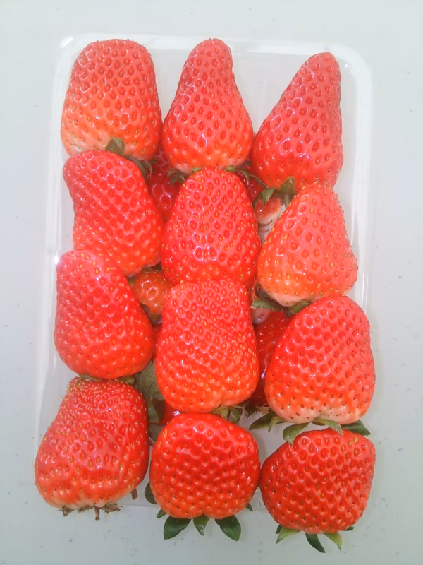 2Lサイズ以上(15g以上)の丸、三角、四角などの色々な形のイチゴが入っています。2段で入っておりますので、1段目は多少上のイチゴの跡がついてしまうことをご了承頂ければと思います。