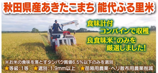 食味計付きコンバインで収穫し、良食値※のお米だけを選別したあきたこまちです。(※お米の食味を落とすタンパク質値6.5%以下のみ選別)