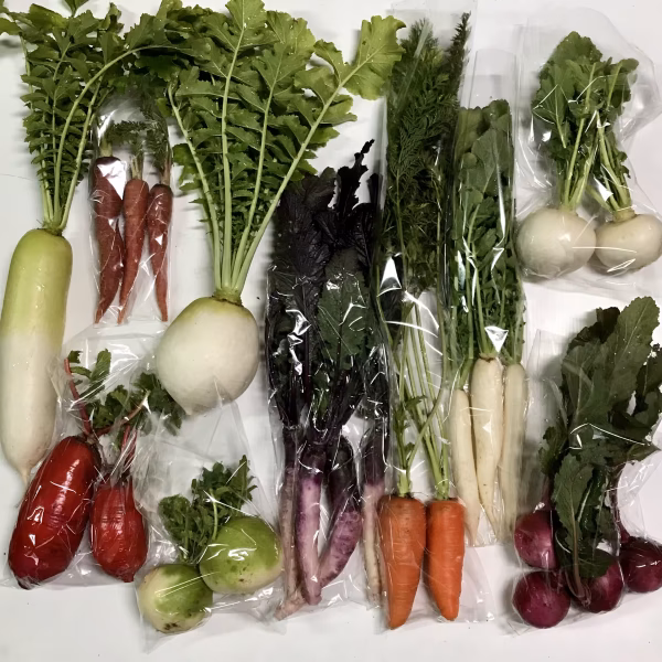 珍しい紅芯大根と赤大根は必ず入れます。後はお任せとなります。雑煮大根、丸大根(聖護院大根)、青首大根、聖護院蕪、蕪「あやめ雪」、日野菜、金時人参、葉付き西洋人参、金時人参、などです。