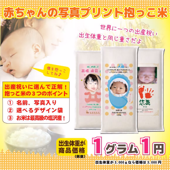 赤ちゃんの出生体重と同じ重さのお米。生まれたばかりの赤ちゃんの重さを全身で感じて下さい!