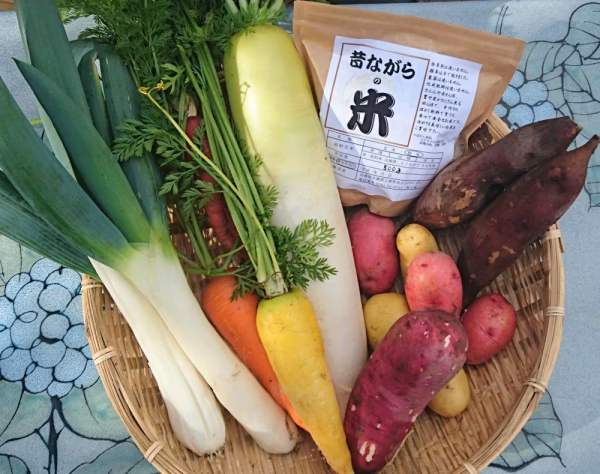 山の落ち葉で作った腐葉土を畑にすき込んで、土づくりをしました。農薬や除草剤、化学肥料を使わない畑のお野菜です。ホタテの貝殻石灰、魚粉、油粕、糠を発酵させてぼかし肥料を使っています。野菜がこんなにおいしいと思わなかったと多くの人にお褒めの言葉を頂いています。新米も同様のぼかし肥料で作った農薬や除草剤、化学肥料を使わない安全・安心のお米で1等米の証明をうけています。瑞々しくお口の中で一粒一粒にお米の旨味が感じられる味です。是非一度ご賞味ください。