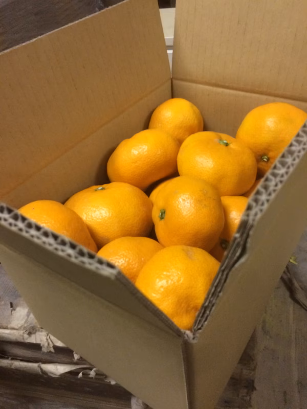 青島とオレンジの掛け合わせ品種、金賀ミカンです。濃厚な甘みと絶妙な酸味で大きなサイズでもしっかりと味があるのが特徴です。大きめ中心ですがバラバラで25個近く入ってます。