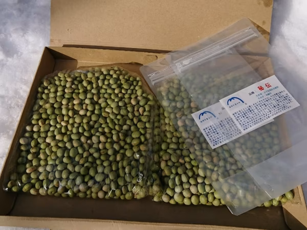 岩手生まれの「秘伝」という青大豆の品種を、枝豆の季節が終わってから雪が積もるまでの2ヶ月間立ち枯れさせ天日乾燥した大豆です。