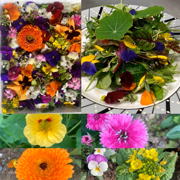ナスタチューム、ビオラ、ナデシコ、アリッサム、トゥルシ、えんどう豆、菜の花、カレンデュラ