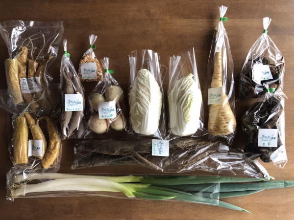 野菜の内容は、ミニ白菜・ネギ・ゴボウ・里芋・サツマイモ(小)・紅心大根(小)・パースニップ・アピオス・沢庵漬けなどを予定しています。ボリュームはレギュラーとスーパーヘビーの2種類で、スーパーヘビーはレギュラーサイズ2世帯分にも対応します。野菜は全て積雪前に収穫した貯蔵野菜となります。苦手な野菜や不要な野菜はお知らせください。