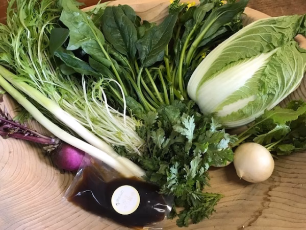 白菜1/2(小白菜1玉) 葉付き長ネギ1本 かぶ1個 水菜100g 春菊(しゃぶしゃぶでぜひ)80g 菜の花 辛味大根(鍋にいれるとホクホクに、すりおろしてポン酢にも) ほうれん草