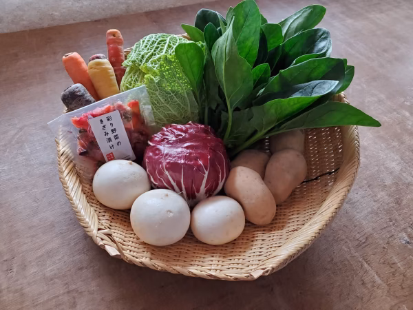 季節の野菜6~8点と、季節の漬物1点が入った野菜セットです。