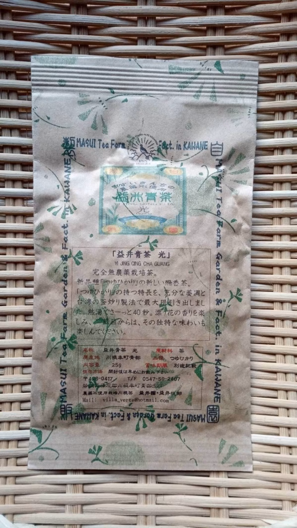 ▼自己紹介 ▼商品概要 ここにしかないシングルオリジンティー「青茶ひかり」ウーロン ▼品種・味の特徴・食べ方 品種「つゆひかり」美しい香りとキレのある味わい。日本青茶ひかりの本質はここにある ▼数量、分量の目安 25g/袋  急須では 5g が目安です ▼栽培/生産方法、こだわり 苗定植時からの農薬不使用栽培川根益井農法で管理 ▼注文に際しての注意点(配送方法や納期指定など)