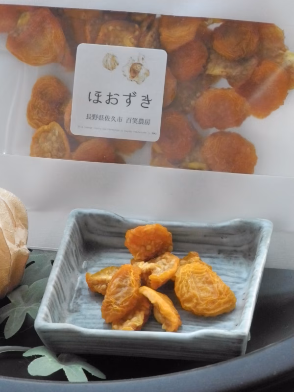 オレンジチェリーって何?・・・はい、食べられるほおずきなんです。百笑農房のオレンジチェリーは大粒でアロマのような香りに特徴があり、オレンジ色でサクランボのようなかわいさ、濃厚でガツンとインパクトのある酸味と、そこはかとない優しい甘味が口いっぱい広がる食味はまさに「食べる宝石」です。見た目もかわいく、ビタミンAがトマトの4倍、鉄分がトマトの2.5倍、そしてビタミンB群のイノシトールが豊富で、いわゆる「スーパーフード」と呼ばれ、美容と健康、アンチエイジングの面からも注目されています。見ても良し、食べても美味しいオレンジチェリーはきっと皆さまをとりこにするでしょう。