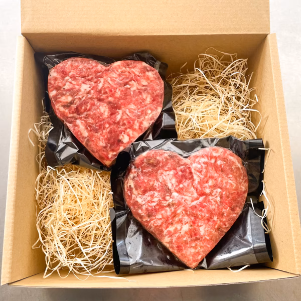 阿蘇赤身和牛(熊本・あか牛)と十勝放牧豚の合い挽きハンバーグを、ハート型に成形しました。ご家庭用はもちろん、大切な人へのプレゼントにおすすめです。