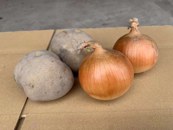 玉ねぎは北もみじ2000で玉締まり良く貯蔵性がとても良い品種ですジャガイモは、とうやと言う品種で、芽が浅く皮が剥きやすい調理後は甘味が強い色味の黄色いジャガイモです。