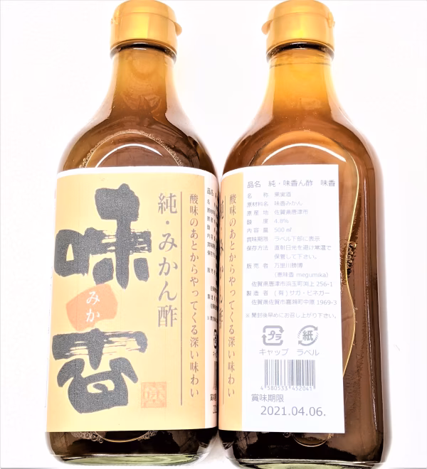 “味香みかん” を100%原料にして、添加物等は一切使用せず、しかも皮丸ごと絞って180日間熟成醸造して出来上がりました。“味香みかん”の持つ深い濃くは引き継がれております。酸度は穀物酢よりも強いです。