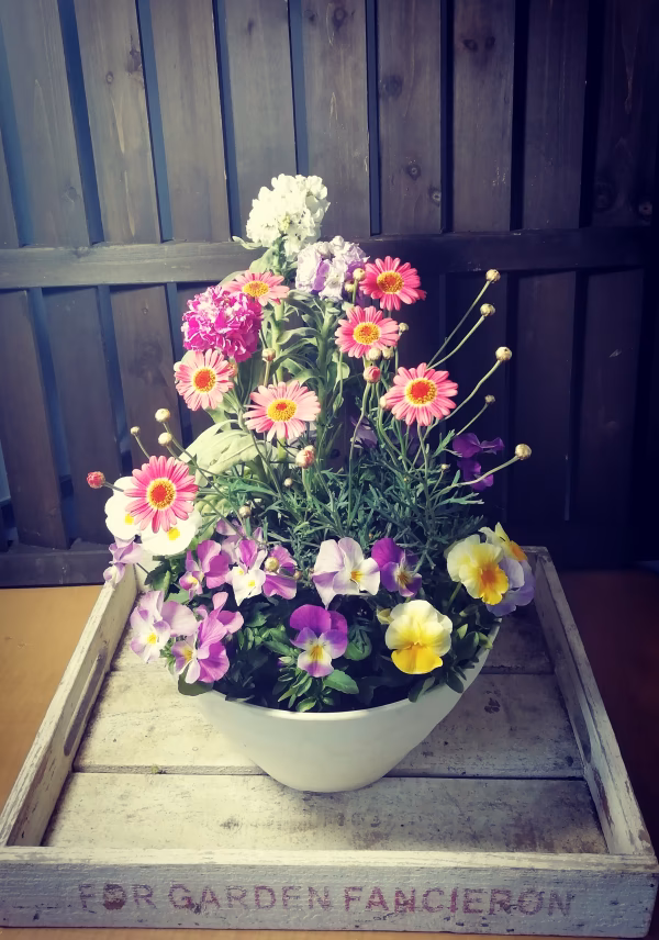 サイズ20センチ程度の春らしい鉢にお花をたっぷり植え付けた