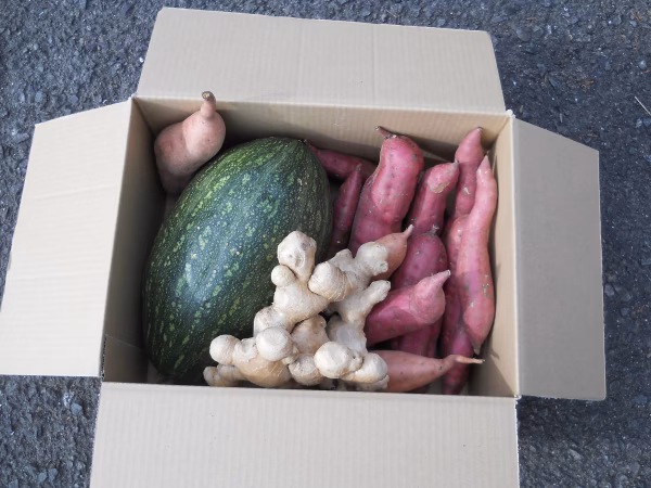 万次郎カボチャは糖度が高く柔らかいネットリ系です。煮物や天ぷらの他スープとしても最高です。また、無農薬ですので離乳食にも安心して利用出来ます。サツマイモは紅はるか、キントキ、安納芋等の中より大小各種が含まれています。ショウガは新ショウガ(甘酢漬けがお勧め)と親生姜(すりおろしや魚の煮つけ用等に)が入っています。
