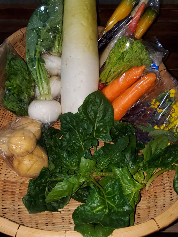 四季折々の野菜を味わっていただいてもらうために露地栽培をしております、低農薬、減化学肥料にて丁寧に育てた野菜を丁寧に収穫、水洗い、袋詰め、梱包してお客様にお届けいたします