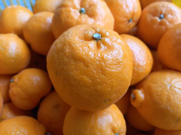 熟成ポンカンです。 12月に収穫したポンカンをじっくりと倉庫内で熟成しました。 なぜ?木にならして完熟ポンカンにしないのか? そう思われると思います。 答えは品種によって栽培方法が違い、その品種に応じたベストな栽培方法を選択しているからです。 1月も木について成らしておきますと今年ですと 風による生傷=腐りの原因 雪による果実のいたみ=食べれなくなります。 などが生じます。 ポンカンはもともとインド原産といわれますので暖かい環境でないとうまく作れないので寒いところではだめなのです。 今回のポンカンは果実がやや扁平で小果で種の少ない低梢系(ていしょう)です。今まで販売していた分は果実が腰高で大果の高梢系(こうしょう)系なので果実の大きさは全体的に小さいもののもちっとした果肉が特徴のポンカンです。濃厚な味が特徴でポンカンによくあるぱさぱさの果実にはなりにくい特徴があります。 是非ご賞味ください。m(__)m ポンカンです 1㌔約7から10玉程度目安です みかんのように皮も剥きやすく、フレーバーな香りと甘さが弾けます。 収穫後のワックス、防止カビ剤、防腐剤は使用しておりません。 二宮果樹園のこだわり ・肥料は有機質肥料を使用しています。  魚かすなどの有機物を含んだ肥料を与えることにより、果実がまろやかな味に仕上がります。 ・除草剤の使用を最小限度にして草を利用した自然と共存する栽培  除草剤の使用回数を減らすことにより、土壌中の微生物の増加と土が柔らかくなり、果実の味が濃厚になります。 ・ワックス不使用で安全安心  果実に光沢を与え、腐りにくくするワックスを使用していません。このため、皮まで安全安心です。 ・収穫後の腐敗防止剤、防カビ剤の不使用  収穫後の腐敗防止剤、防カビ剤の使用を行っていないので皮まで安全安心 ・価格を抑えた果実販売  不要な農薬、不要な肥料など生産コストの削減を行うことにより、味の濃厚なおいしい果実をお客様にお手ごろな価格でご提供いたします。 ・畑へのこだわり  お金を出しても、どんなに努力しても手に入れることのできないのが太陽の光です。二宮果樹園では太陽のたくさん当たる畑にこだわって果実を作っています。 ・購入者も畑に来られるオープン栽培  二宮果樹園には実際に栽培されているところを見てみたいといわれるお客様には畑にて園主自らが説明を行っています。 ・多種多様な栽培品目 極早生みかんから河内晩柑まで多種多様な品種を栽培しています。