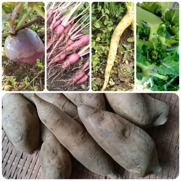 ヤーコン800g、紫大根(または紅芯大根)、飛鳥茜蕪、島にんじん、プチベール