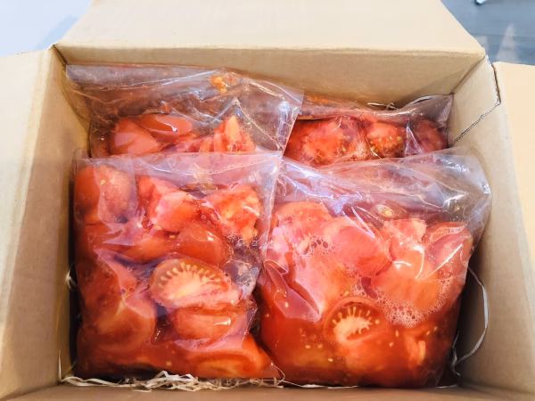 主に直売所向けに、収穫していますので、完熟トマトのカットしたトマトの冷凍です。