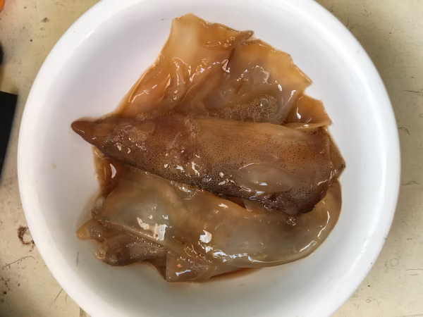 大きいイカだと皮が厚いためタレが染み込みにくい上、1匹丸ごとかじりつくことが出来ない為わざと小さめのイカにしています。