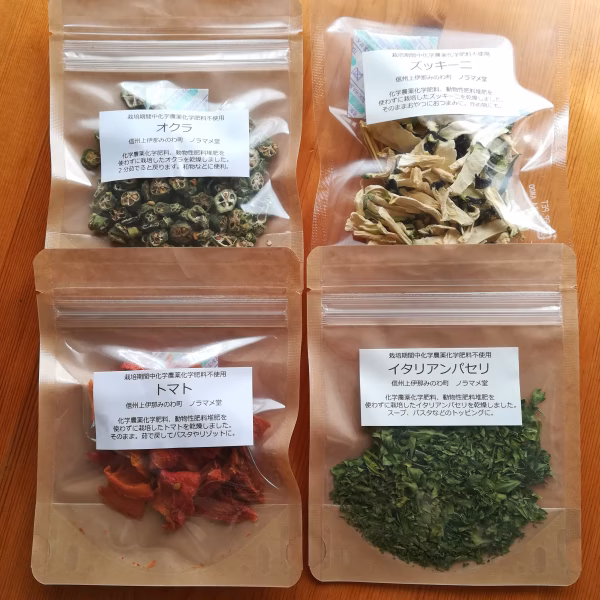 化学農薬、化学肥料を使わずに栽培したトマト、ズッキーニ、オクラ、イタリアンパセリを手軽に召し上がっていただけるよう乾燥させました。