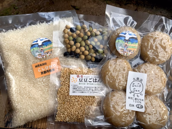 煎った豆と炒った玄米にセットの減農薬コシヒカリと