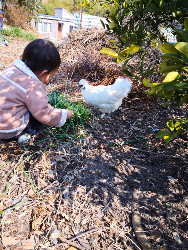 烏骨鶏を日中は放し飼い、夜は小屋に入れて飼養しています。