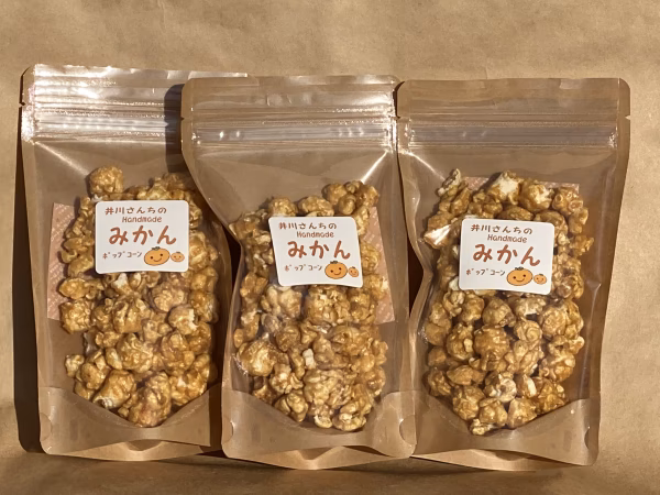 『井川さんさんちのみかんジャム』を、ポップコーンに絡めました!!ほのかに感じるみかんの味が楽しめるポップコーンです!