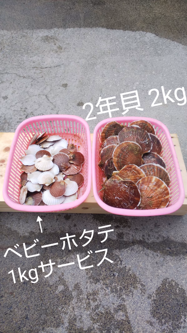 - 2年貝 7kg、11kgにはベビーホタテを2kgサービスでお付けします。
