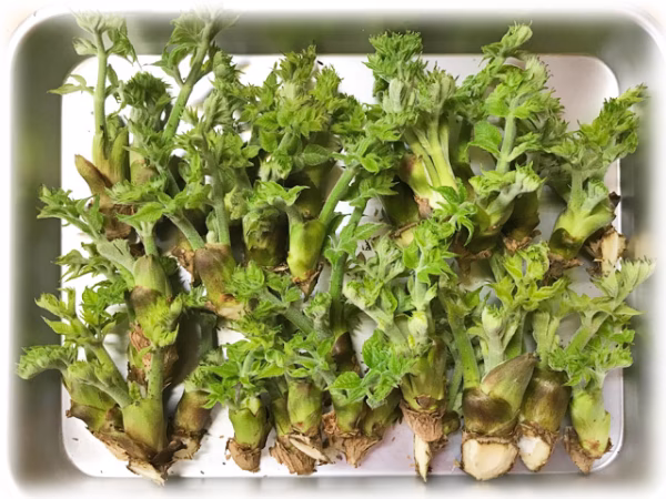 山形県の農家が育種されたタラノキ(品種名「あすは」)を植栽し、晩秋に伐採、そして3〜4月に促成ふかし栽培で生産しています。