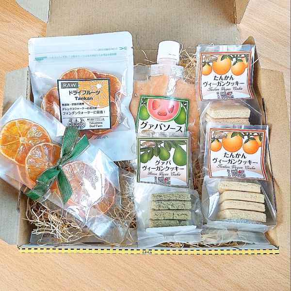 - グァバソース:グァバ、きび糖、レモン果汁 グァバヴィーガンクッキー:米粉、アーモンドプードル、屋久島産グァバ葉、片栗粉、ココナッツオイル、メープルシロップ たんかんヴィーガンクッキー:米粉、アーモンドプードル、屋久島産たんかん果皮、片栗粉、ココナッツオイル、メープルシロップ たんかんドライフルーツ:たんかん、きび糖