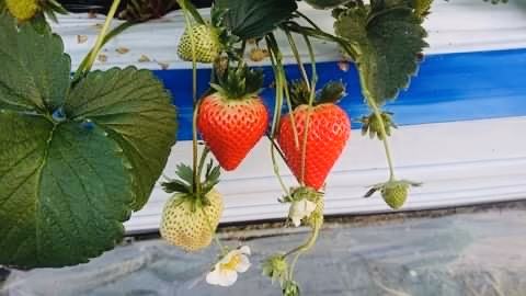 ▼ 今年初挑戦の「おおきみ」。朱色の実に、食感と味は桃に似ています。実が少なく1回の花で6個ほどしか採れません。また、実が多くならないので、全国的に作っている農家は極僅かで稀少なイチゴです!