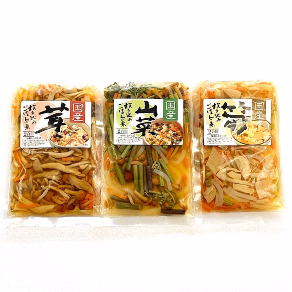 - <たけのこごはんの素> 孟宗竹・こんにゃく・人参・ごぼう・みず・醤油・食塩・アミノ酸・発酵調味液・クエン酸(一部に大豆・小麦を含む) <きのこごはんの素> ぶなしめじ・まいたけ・なめこ・人参・ごぼう・醤油・発酵調味液・食塩・アミノ酸・クエン酸(一部に大豆・小麦を含む) <山菜ごはんの素> わらび・なめこ・こんにゃく・人参・醤油・発酵調味液・アミノ酸・クエン酸(一部に大豆・小麦を含む)
