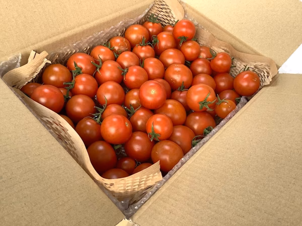 ダンボール箱にバラで詰め、ガムテープで梱包します。箱内の緩衝材はエアーキャップと紙を使います。一般的にスーパーで販売されているミニトマトが170から200gなので、ミニトマトパック6~7パック分に相当します。トマト好きな4人家族であれば1週間で食べきる量かと思います。完熟一歩手前で収穫しますので、お手元に届くころには完熟になります。25度以下常温保存で5日間、18℃以下冷暗所保存で7日間、冷蔵庫保存で10日間がお召し上がりいただける目安です。