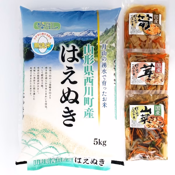 雪若丸は5㎏ 無洗米 炊き込みご飯の素は茸・筍・山菜それぞれ1袋ずつの