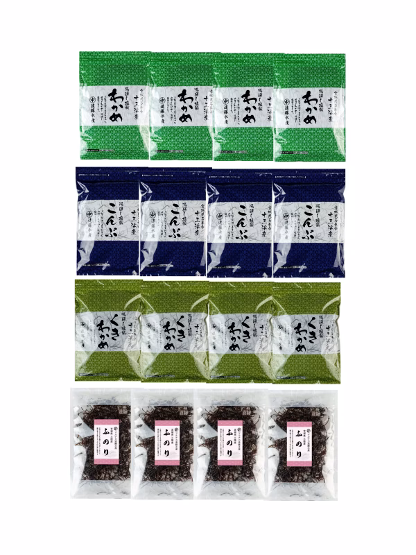 ●わかめ、 名称:湯通し塩蔵わかめ 原材料:わかめ(十三浜産)、塩 内容量:120g ●茎わかめ 名称:湯通し塩蔵わかめ 原材料:わかめ(十三浜産)、塩 内容量:400g ●昆布 名称:湯通し塩蔵昆布 原材料:昆布(十三浜産)、塩 内容量:300g ●ふのり 名称:乾ふのり 原材料:ふのり(十三浜産) 内容量:12g  製造者:㊥マルナカ遠藤水産 宮城県石巻市北上町十三浜字大指89-2   遠藤俊彦