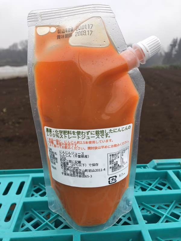 農薬や化学肥料を使わずに栽培したにんじんだけで、ジュースを作りました。砂糖や塩なども使っていないにんじん100%のストレートジュースですが、砂糖が入っているのでは?と思う程に甘く出来ました。   ・1パック320gに、人参を約2.5本使用。   ・1パックでコップ約2杯分です。   ・ボトルキャップ付きのパックですので、    例えば朝夕1杯ずつ分けてお飲みになる    場合でも、パックのまま保存できます。 賞味期限は製造日より2ヶ月となっております。原則として、1ケ月以上賞味期限のあるものをお送り致します。 にんじん生産の状況により、発送をスキップさせて頂くことがございます。その際は事前にご連絡致します。 予めご了承のほど、お願い致します。