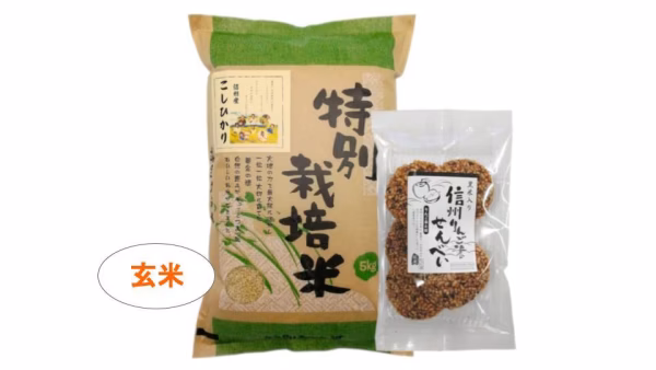 「信州りんご米せんべい」は、無農薬で育てた「信州りんご米」と、黒米で作ったおせんべいです。お米の風味を味わっていただけるよう、味付けは控えめに仕上げており、お米の粒感を感じていただけるような歯応えを意識して作りました。