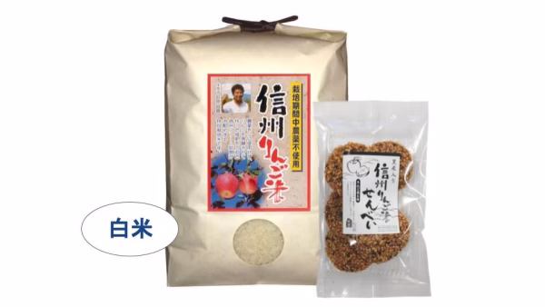 「信州りんご米せんべい」は、無農薬で育てた「信州りんご米」と、黒米で作ったおせんべいです。お米の風味を味わっていただけるよう、味付けは控えめに仕上げており、お米の粒感を感じていただけるような歯応えを意識して作りました。