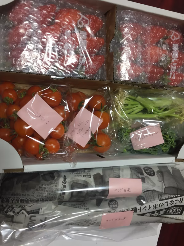イチゴ4パックの段ボール箱にイチゴを2パック、残りの半分には色々な野菜を詰めてお届けいたします。