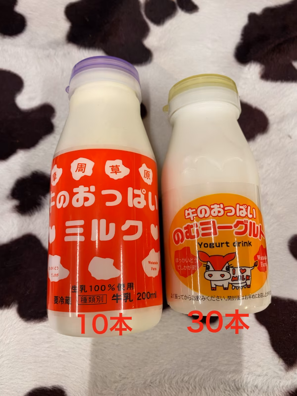 - 牛のおっぱいミルク 200ml×10本、のむヨーグルト150㎖×30本 冷蔵で10℃以下で保存 賞味期限 ミルク8日、ヨーグルト15日
