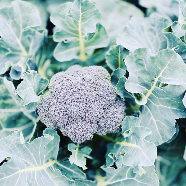 越冬ブロッコリーは花蕾の肥大時期を厳冬期に生育させるので通常のブロッコリーと違い、寒さのストレスを与える事によってブルーベリーなどに含まれるアントシアニンが豊富で淡い紫色になります。
