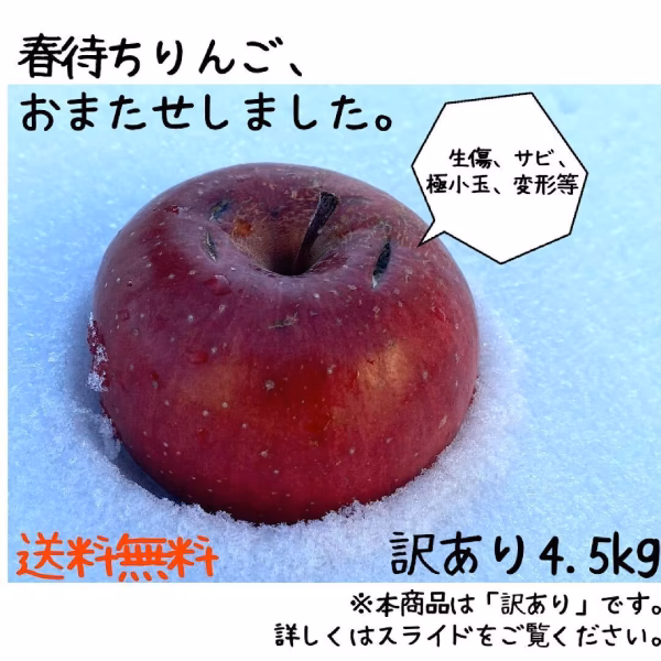 ▼自己紹介 信州長野にて若いスタッフたちで始めた、おおぐし農園2です。 自分が思ういちばんうまい果物を全国の皆様にお召し上がりいただきたいので、こだわりは完熟収穫・食べごろ発送!自信を持ってお届けします。 また2016年から養蜂もスタート。 約6万匹のミツバチたちとともに今日も心を込め、たくさんの果物を育てています◎ ▼商品概要 本商品は、皆様からご好評を多く頂いている「春待ちりんご」訳あり 4.5kgです。春が近づくにつれ、春待ちりんごシーズンもまもなく終わりを迎えます。そこで、数が限られておりますが、春待ちりんごを大特価にてご提供させて頂きます◎ 春待ちりんごはこれがラストチャンスとなりますので、ぜひお召し上がり下さい! 大きさは、極小から大玉のものとなり、おやつにも丁度良いサイズです。見た目はあまり良くありませんが、味や食感は通常のりんごと変わりません。甘くてシャキシャキとした歯ごたえのある、美味しいりんごですよ♪ ただ、本商品は「訳あり」ですので生傷、サビ、変形果実等が入ります。ご了承ください。 ▼品種・味の特徴・食べ方 ・サンふじりんご  瑞々しいりんごですので、そのままガブッと召し上がって下さい! ▼数量、分量の目安 13~25個の4.5kg ▼栽培/生産方法、こだわり 「スマートフレッシュ」という最新テクノロジーを用いて、りんごを長持ちさせているため、旬が過ぎてしまった今でも、美味しいりんごをご堪能いただけます!  スマートフレッシュとは??? 収穫直後のりんごの品質を長く保てる最新テクノロジーのことです。「最新テクノロジーって、体に影響を及ぼさないの?」と心配になる方がいらっしゃるかもしれませんが、ご安心ください。 この「スマートフレッシュ」は果実の内部にも外部にも影響のない安心で環境に優しいテクノロジーです。日本では2010年からりんごだけでなく、梨や柿の保存方法にも取り入れられています。 私たちは、農業を若い世代でも楽しめる業界にしたく、伝統と最新技術をバランスよく取り入れながら、常に進化を続けています。 そして私たちが作っているりんごは、誰でも安心して購入できるように農薬を減らし、除草剤を使わずに丁寧に手間をかけて育てています。 ▼注文に際しての注意点 りんごの大きさは指定できませんので、あらかじめご了承下さい。