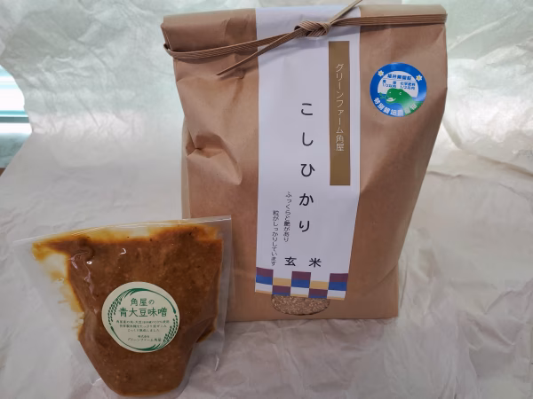 グリーンファーム角屋で丁寧に栽培した特別栽培コシヒカリの無洗米と青大豆はもちろん糀まで自家製で作った贅沢な青大豆味噌の詰め合わせです。