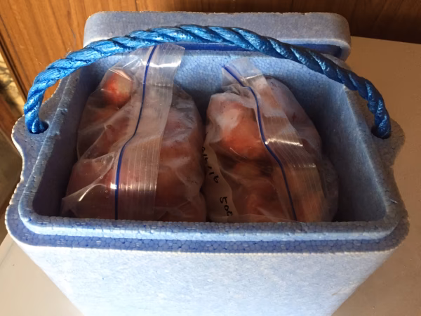 100円ショップの簡易クーラーボックスに入れてお届けしますのでクーラーボックスも再利用ください。