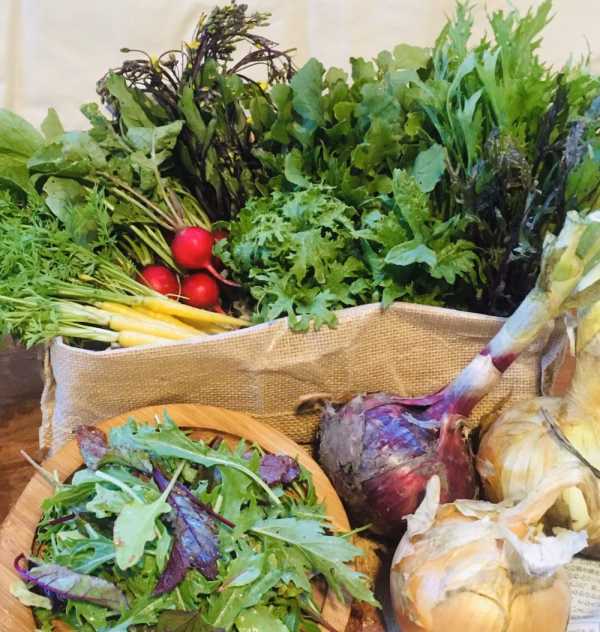 ラディッシュ・水菜・紫水菜・サラダ菜・ルッコラ・コーラルリーフ・山東菜・小松菜・ほうれん草・春菊・ベビーリーフミックス・大根・赤らっきょう・新玉ねぎ・根深ネギ・小カブ等