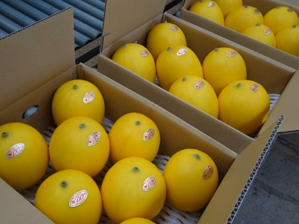 「キンショーメロン」は果皮に網目がなく表面がなめらかなノーネットメロンです。やや縦長の楕円形をしていて、サイズは500~800gと小さめ。皮は濃い黄色で、果肉はきれいなクリーム色をしています。