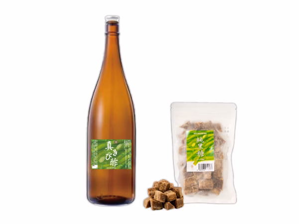 気持ちよく使えるお得な一升瓶サイズのきび酢を入れた箱の隙間に、黒糖も同梱してお届けします。