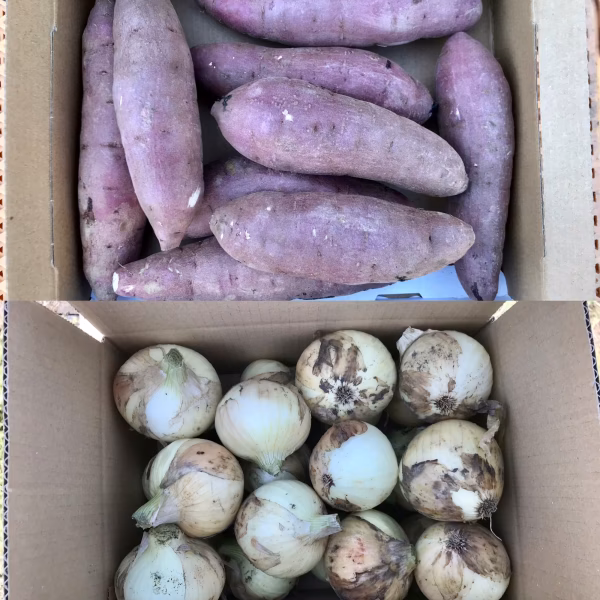 鹿児島産の新玉ねぎ箱込み1キロ前後、サツマイモ 1ロ前後注文を受けてから、収穫日に収穫した箱込み2キロ前後を畑の空気も収穫しながらAB品大中小混合箱詰めして、当日発送します^_^
